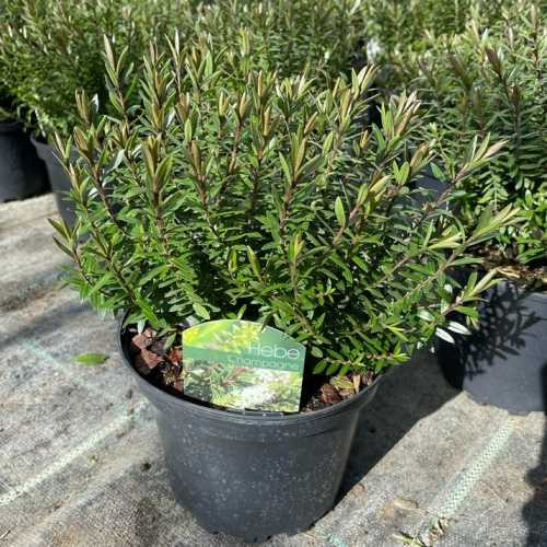 Ismerje meg a Hebe - 'Champagne' - Veronikacserje varázslatos szépségét! Ez az örökzöld díszcserje garantálja a folyamatos kerti élményt. Kompakt formája és a 'Champagne' fajtára jellemző, hűvösebb időben bronzosodó lombozata különleges látványt nyújt. Ideális választás balkonládába, virágágyásba vagy sziklakertekbe. Könnyen gondozható és csodás virágokkal hálálja meg a gondoskodást. Teremtsen időtálló eleganciát kertjében!